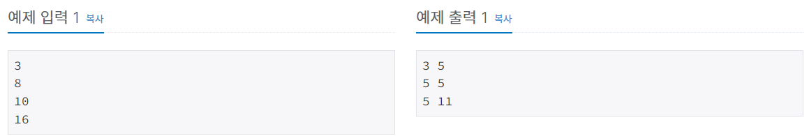 각 테스트 케이스에 대해서 주어진 n의 골드바흐 파티션을 출력한다. 출력하는 소수는 작은 것부터 먼저 출력하며, 공백으로 구분한다.