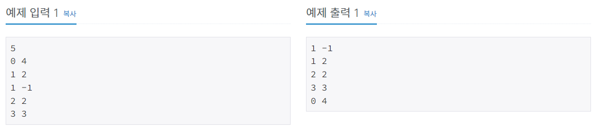 첫째 줄부터 N개의 줄에 점을 정렬한 결과를 출력한다.