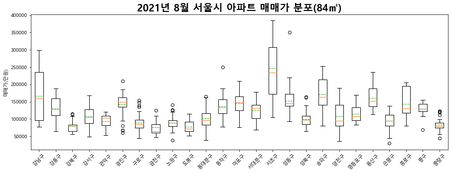 plt.title('2021년 8월 서울시 아파트 매매가 분포(84㎡)', size = 20, weight = 'bold')