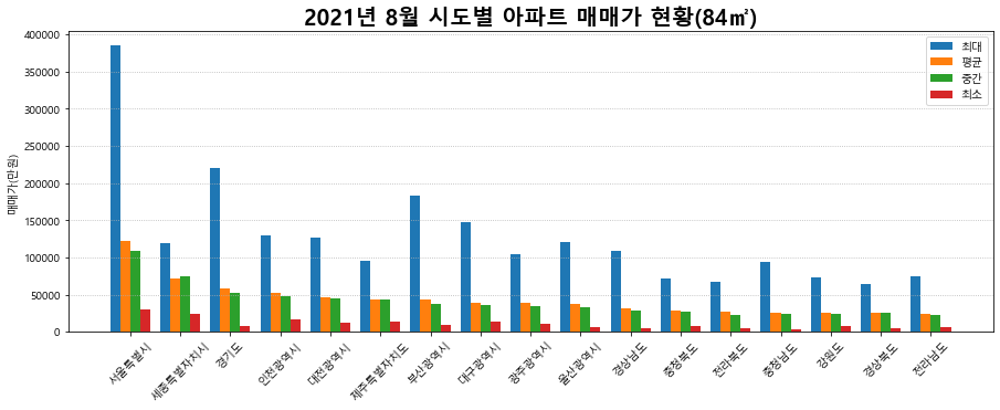 plt.title('2021년 8월 시도별 아파트 매매가 현황(84㎡)', size = 20, weight = 'bold')