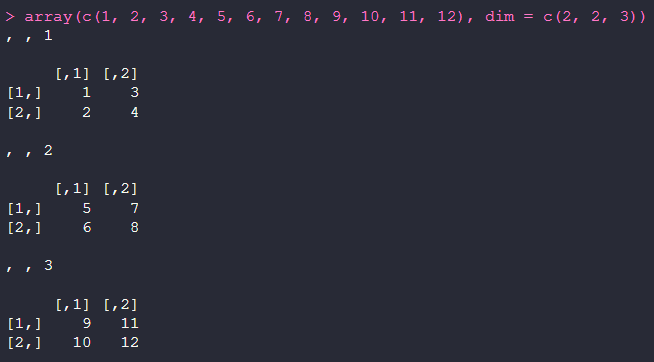 array(c(1, 2, 3, 4, 5, 6, 7, 8, 9, 10, 11, 12), dim = c(2, 2, 3))