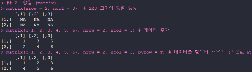 - 생성 방법 : matrix(nrow = 행 크기, ncol = 열 크기)