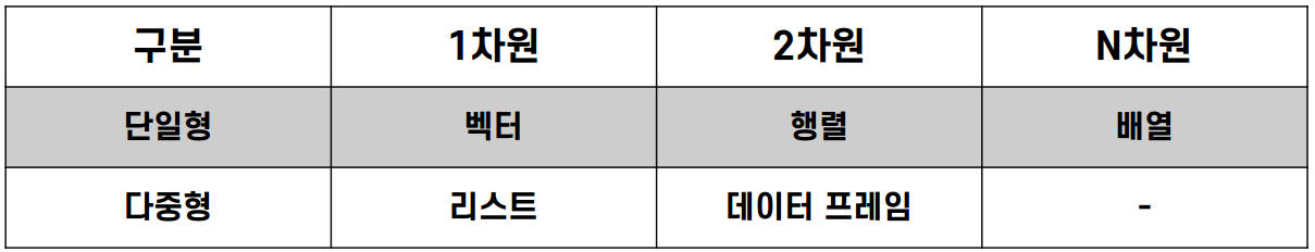 - 단일형, 2차원 데이터 자료 구조