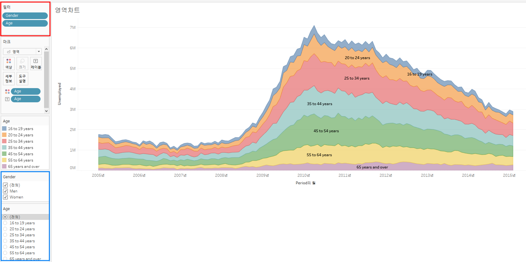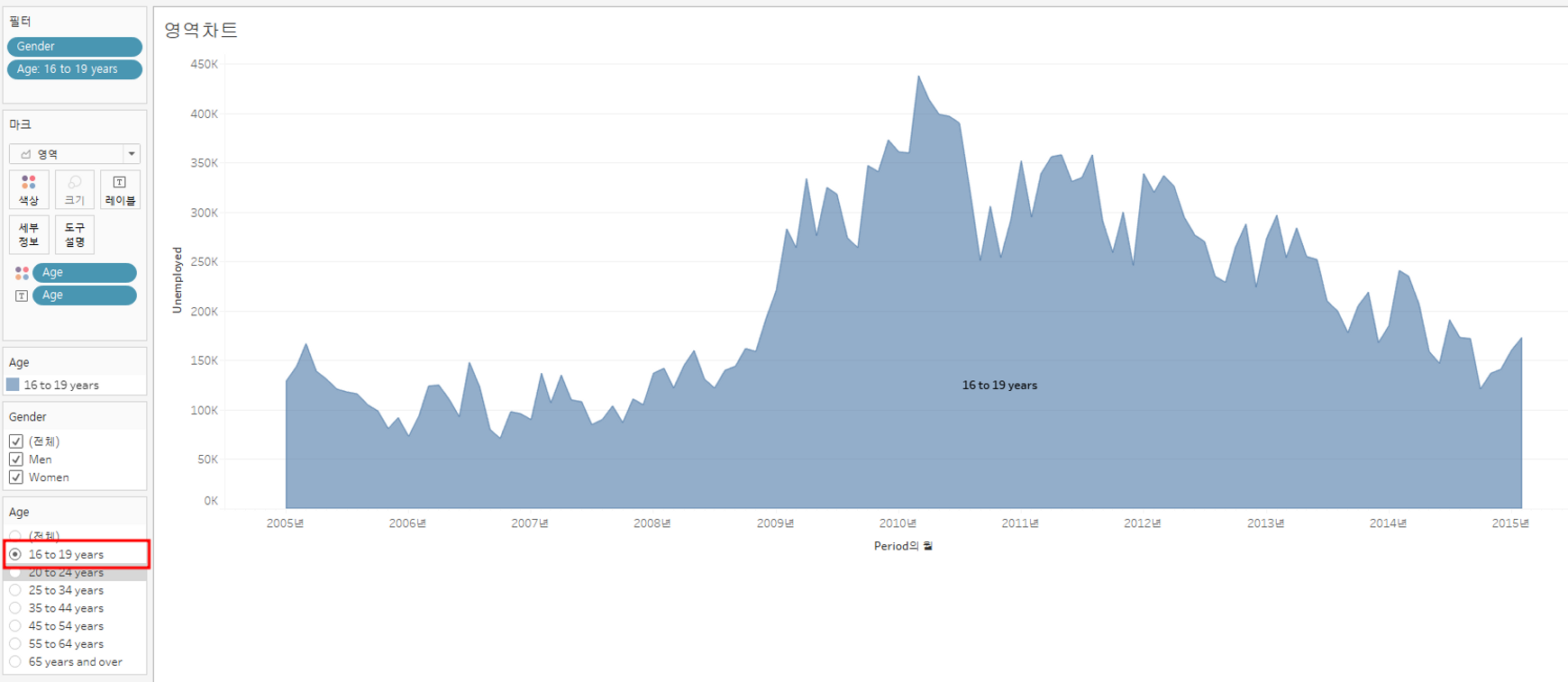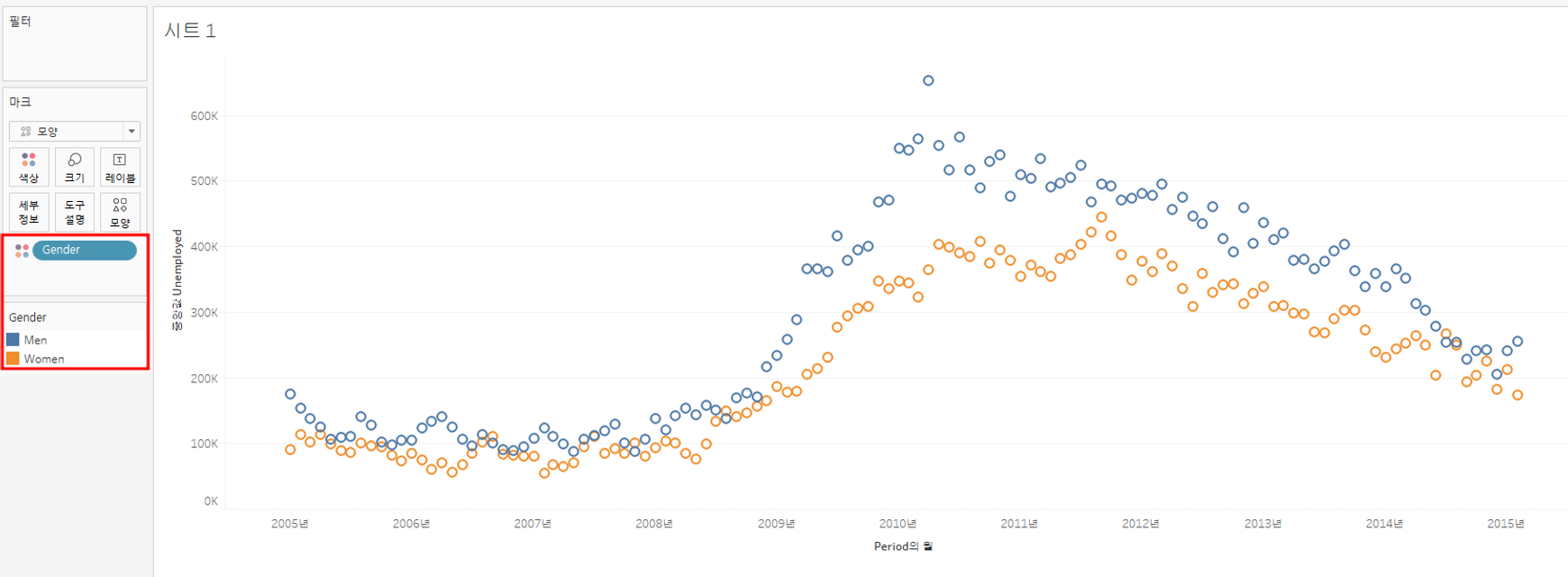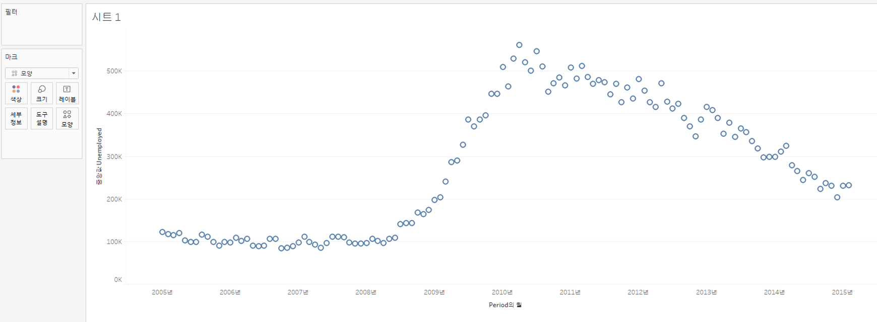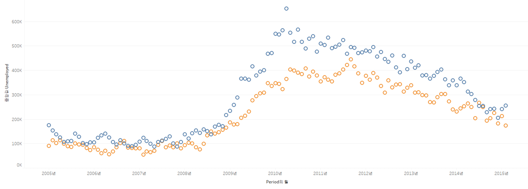 실업자 수(Unemployed)가 시간대(Period)에 따라 어떻게 변하는지 확인