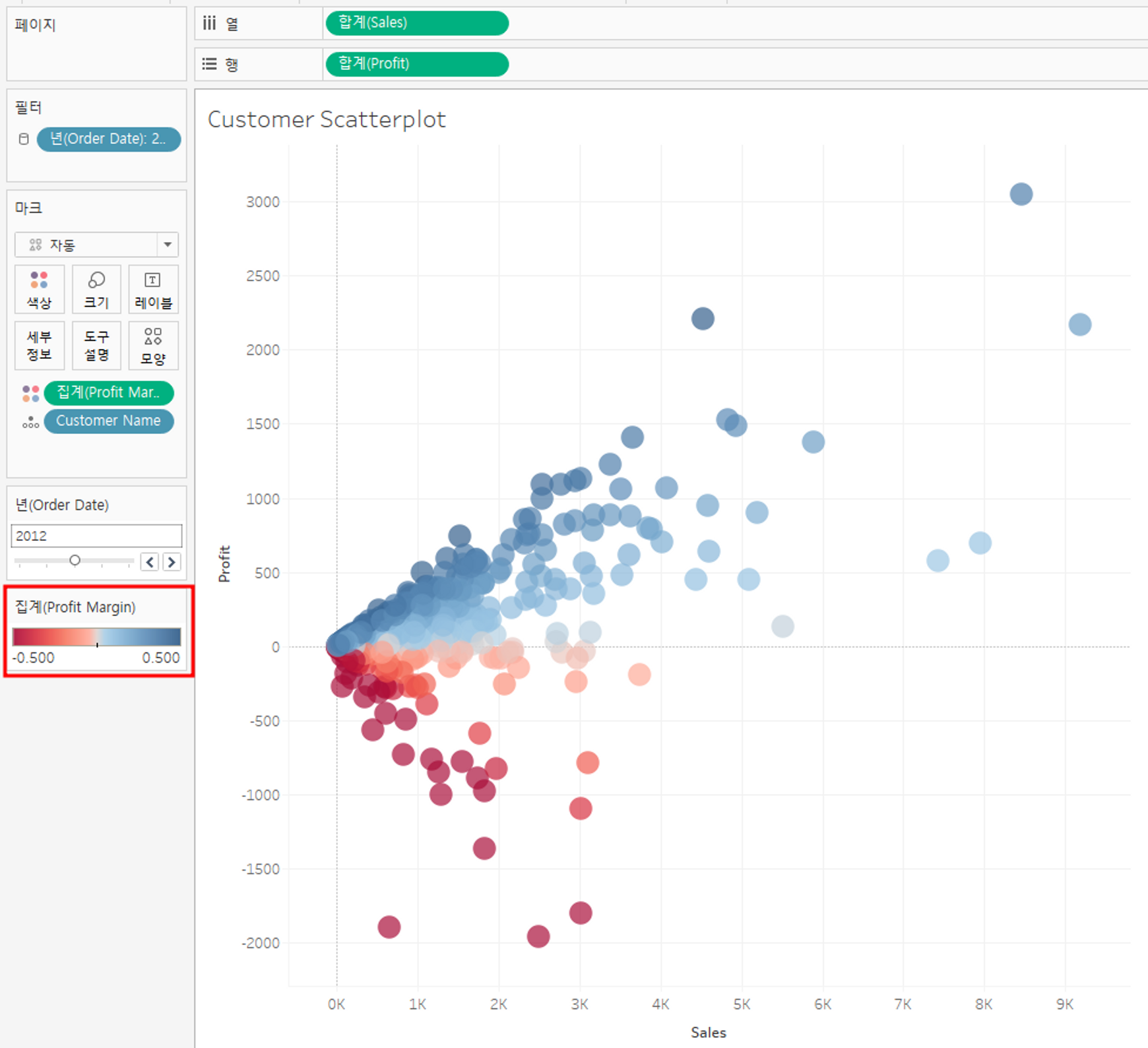고객 이름을 기준으로 산점도를 그렸으며, 순이익에 따라 색깔을 추가하였다.