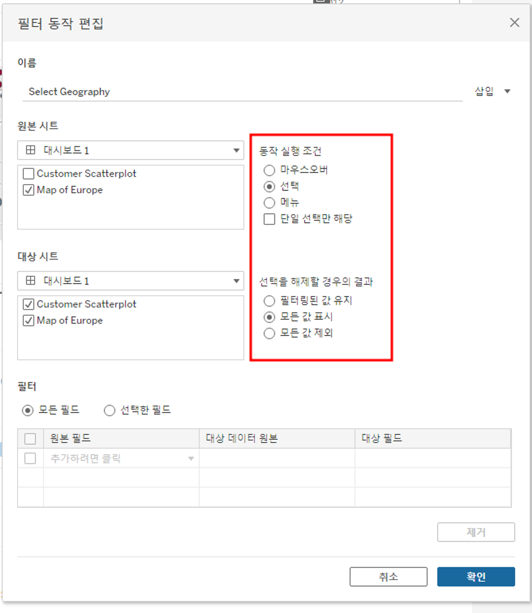 대시보드 > 동작에서 원하는 필터 상호작용을 설정할 수 있다.