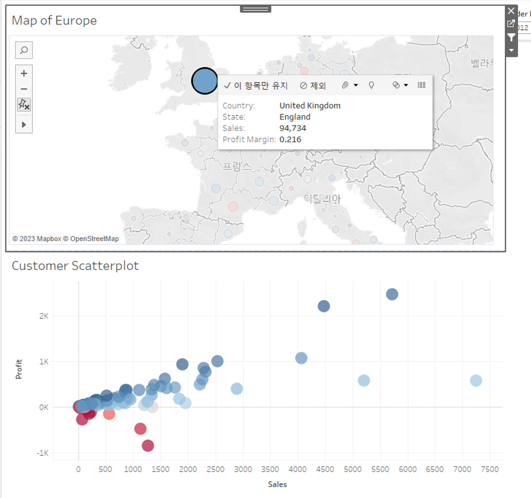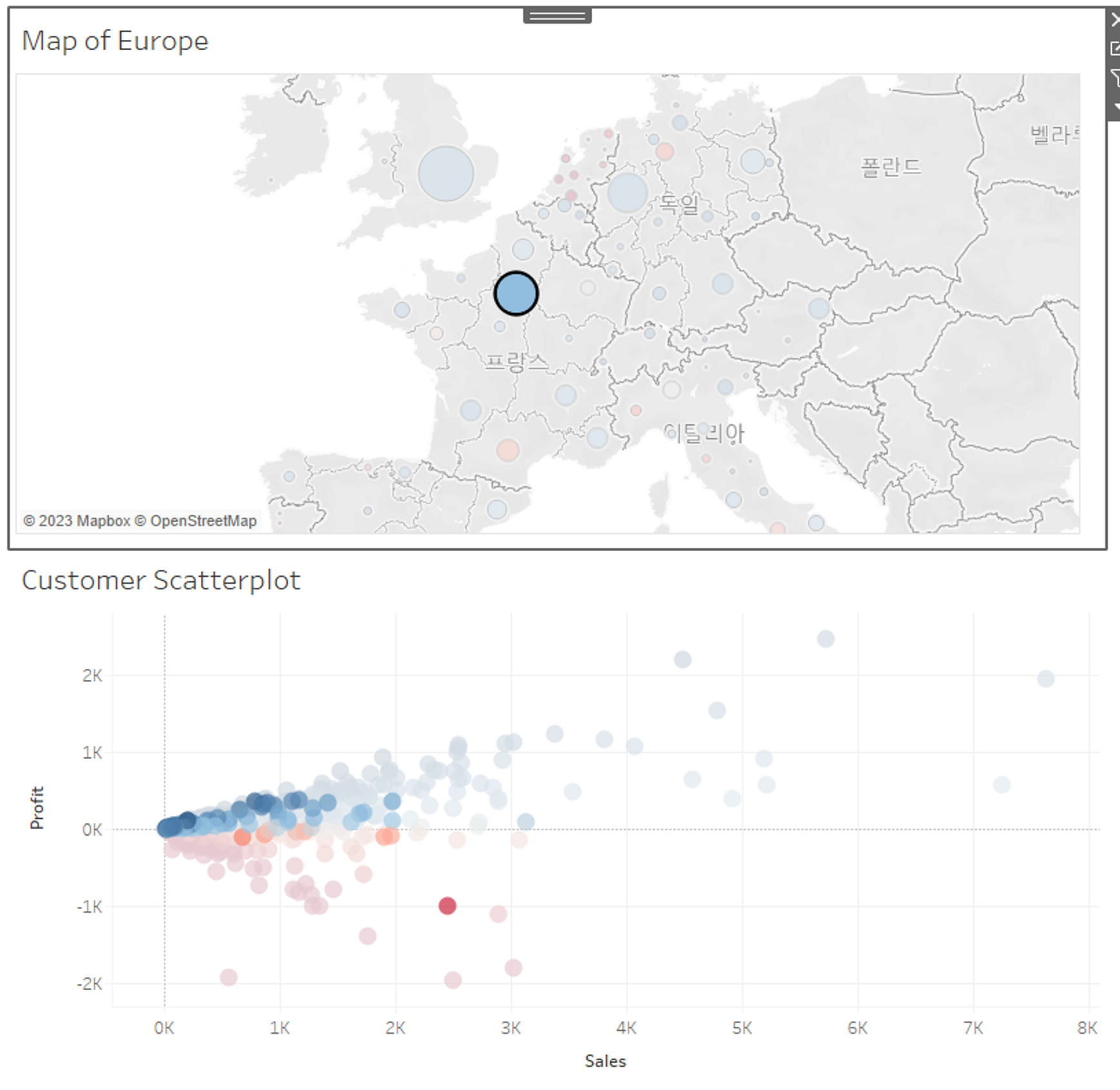 유럽 내 특정 상점의 판매량을 지도를 통해 분석해서 얼마나 많은 수익을 올렸는지 확인해보고 산점도를 이용해 소비자 분석을 해보자.