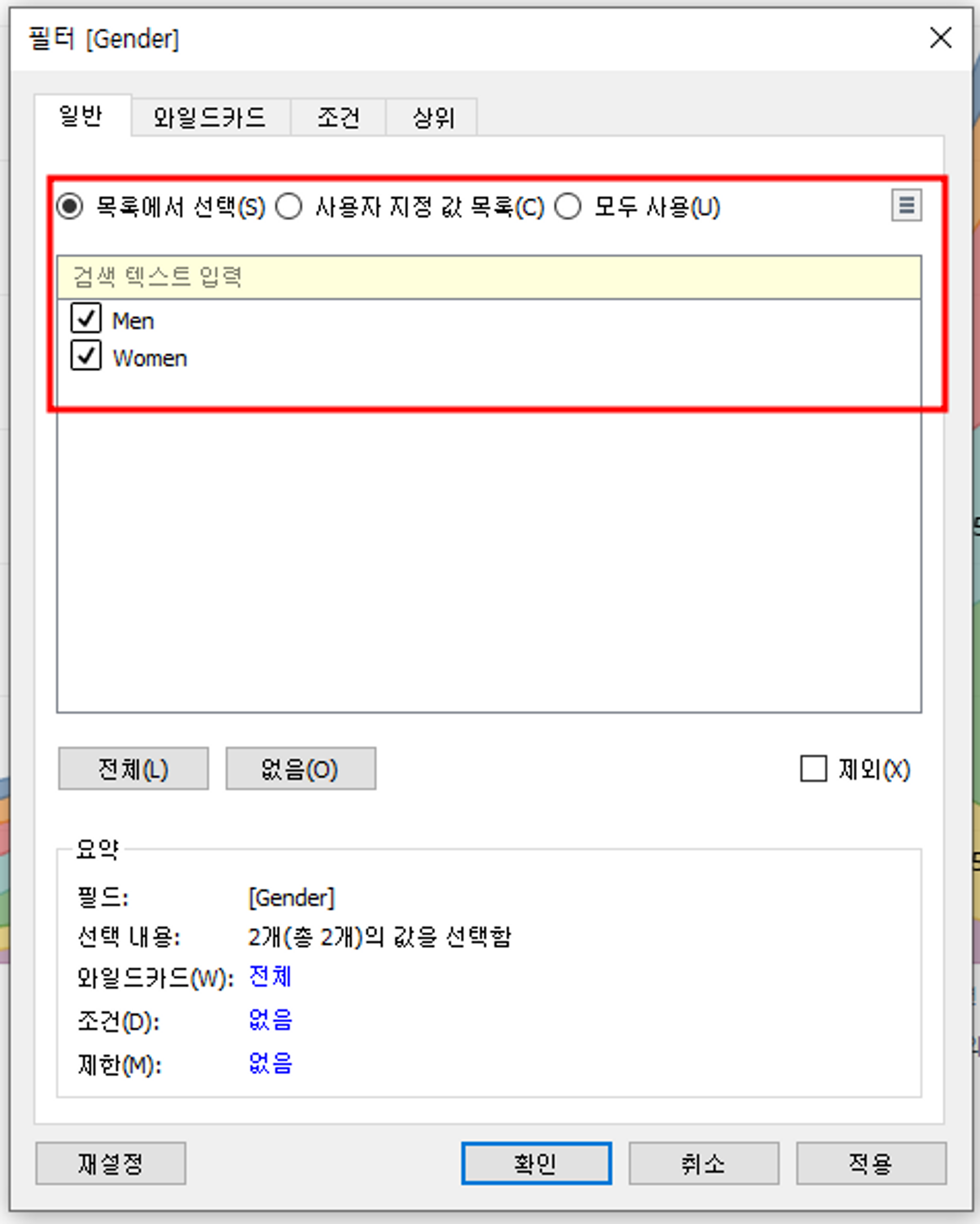 필터의 종류도 따로 설정할 수 있다. (단일값, 다중값)