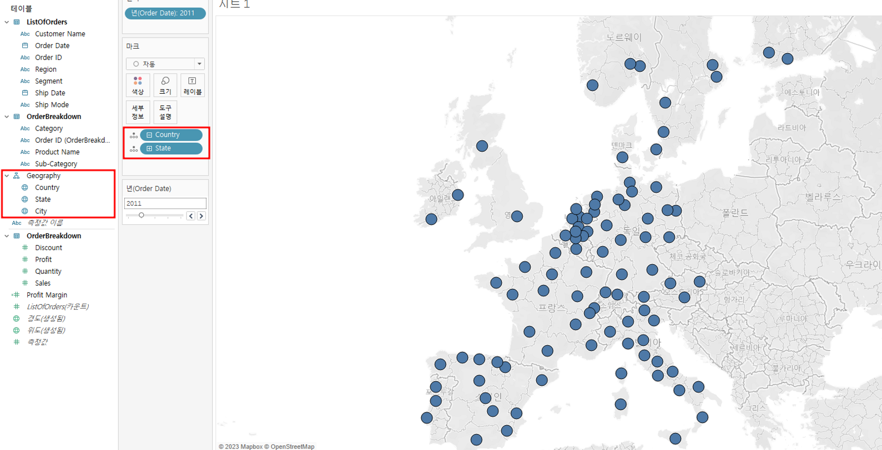 2) 연도별 각 지역의 수익을 확인하기 위해 년(Order Date)를 필터에 추가한다.