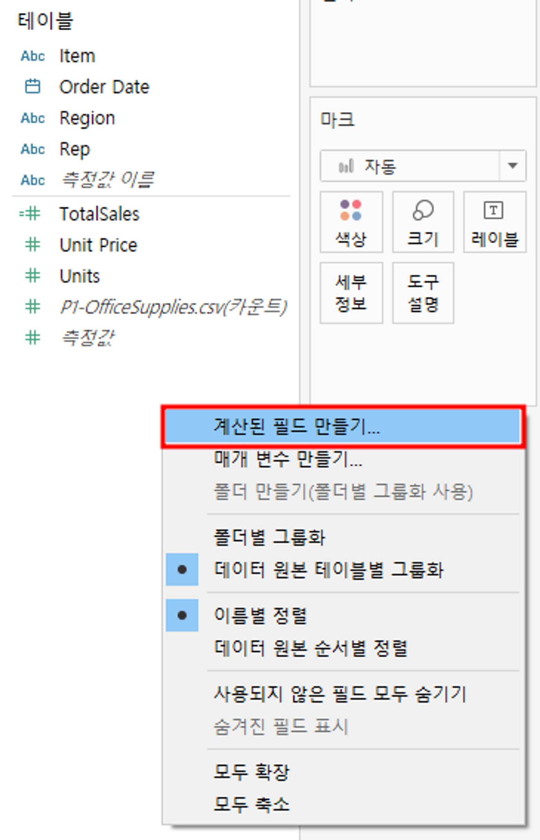 ▶ 데이터에 우측 클릭 > 계산된 필드 만들기 > 창에서 원하는 계산 입력