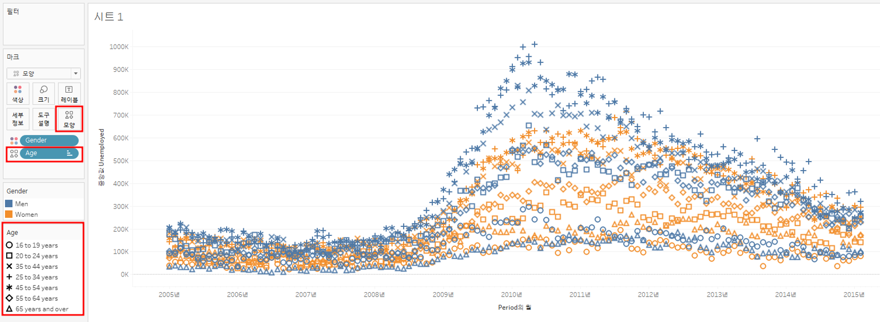 Age 컬럼을 모양 아이콘에 드래그하였더니, Age 별 모양이 달리하여 그래프에 표시된다.