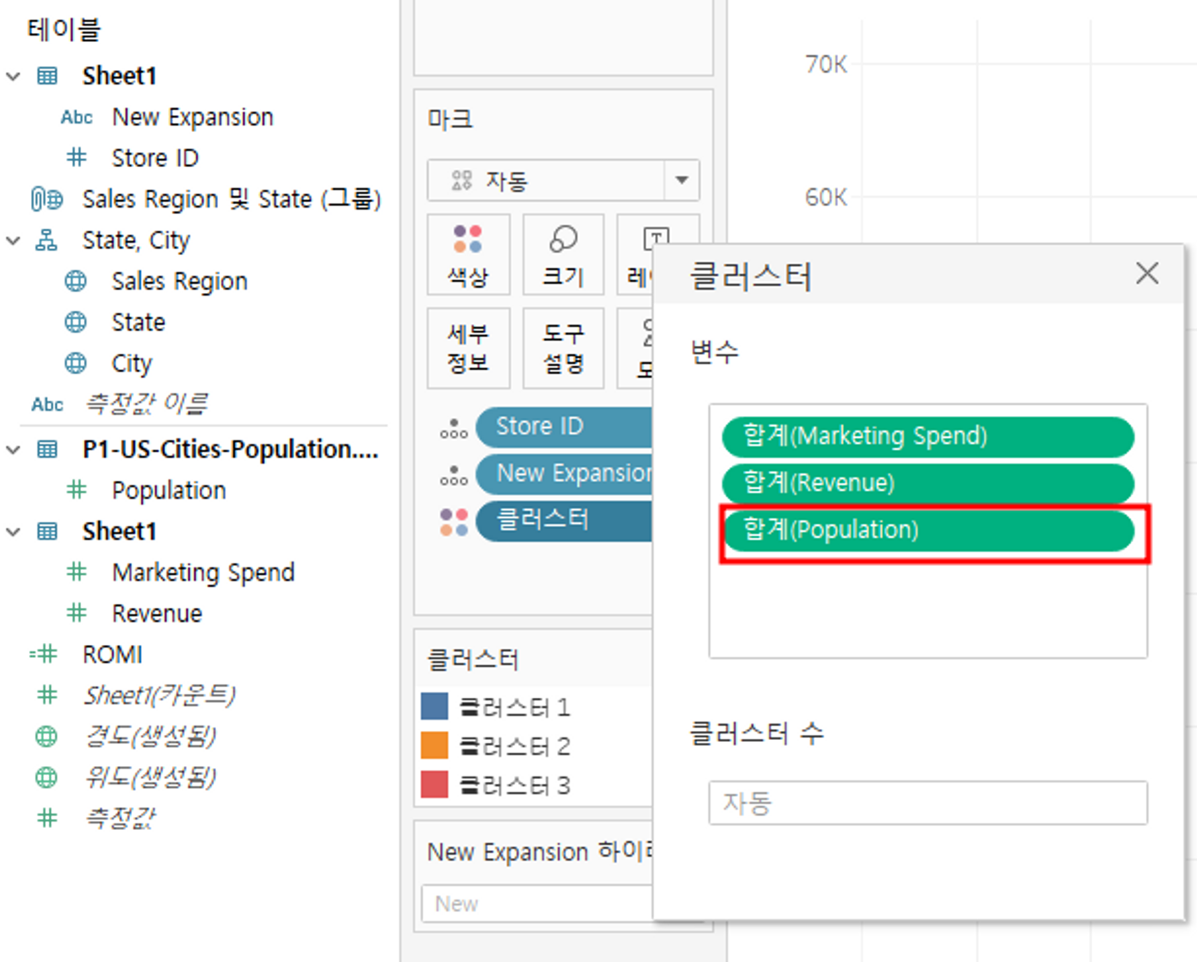 태블로는 이 3개의 변수를 보면서 유사성에 따라 어떤 클러스터 그룹으로 묶을지 판단한다.