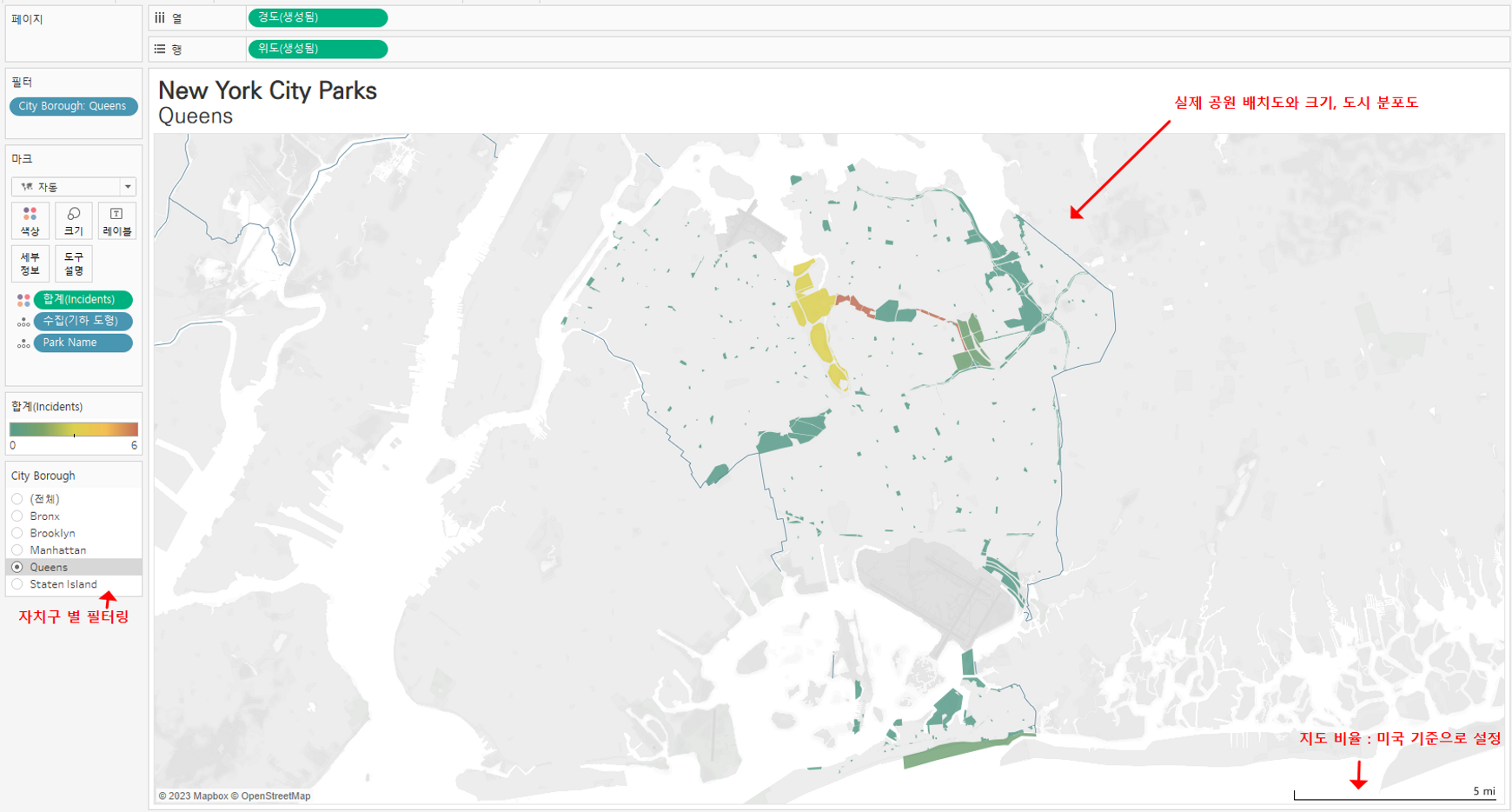 워크시트에 ‘기하 도형’ 필드를 드래그하면 공원 지도가 그려진다.