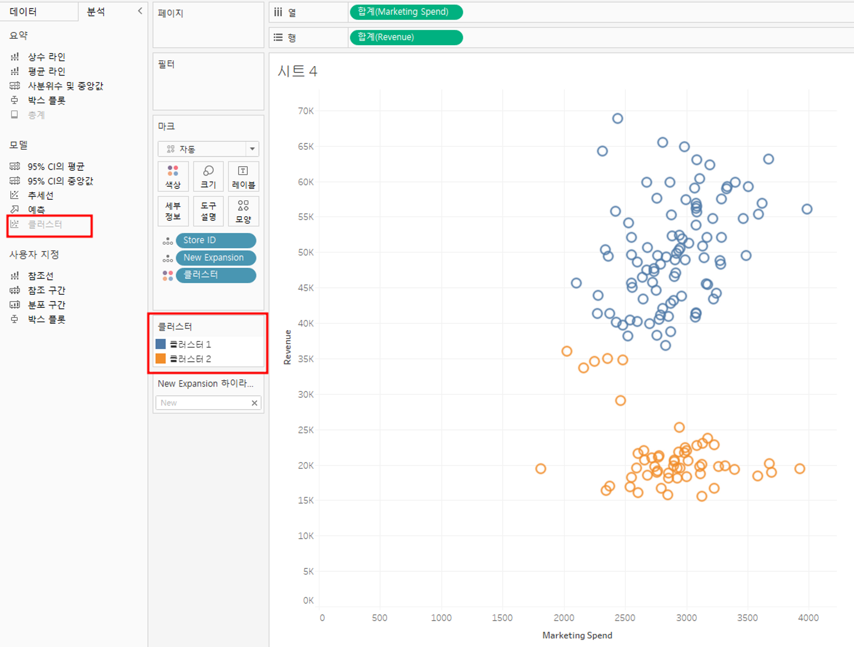 → 분석 > 모델 > 클러스터링을 시트에 드래그