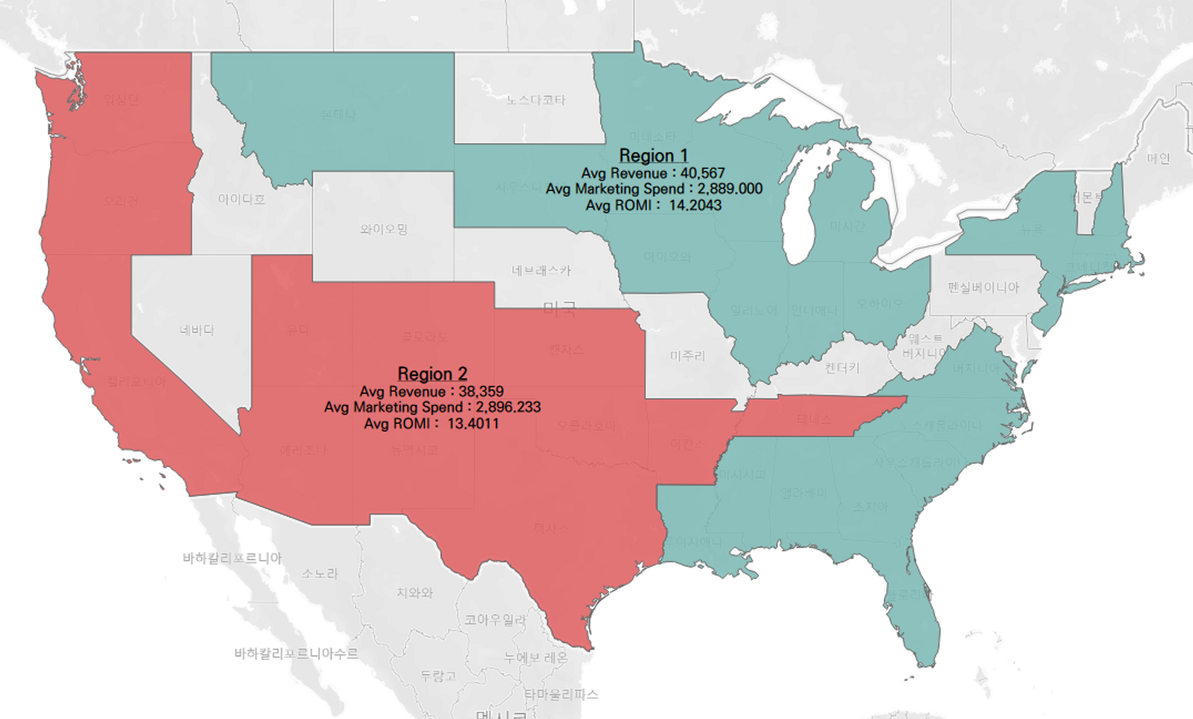 ▶ Region 1의 평균 수익과 마케팅 투자 수익이 Region보다 조금 높다.