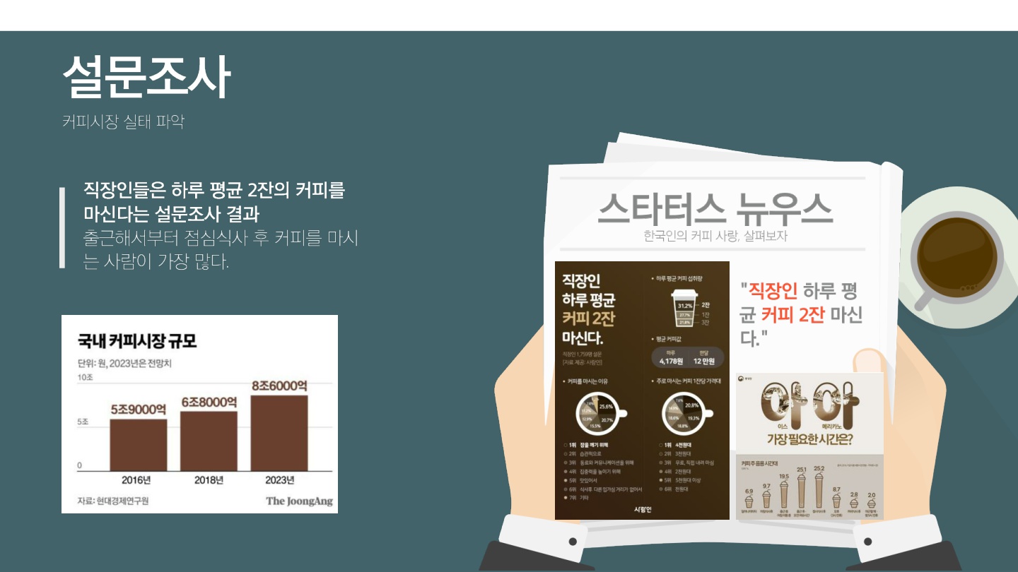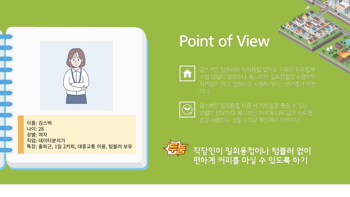 - 목표 : 직장인이 일회용컵이나 텀블러 없이 편하게 커피를 마실 수 있도록 하기