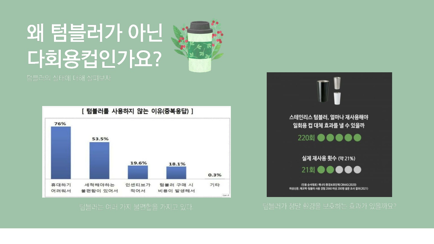 일회용컵을 사용하지 않으려면 텀블러를 사용하는 방법이 있지만 우리는 텀블러가 아닌 다회용컵의 활용을 높이고자 하였다.