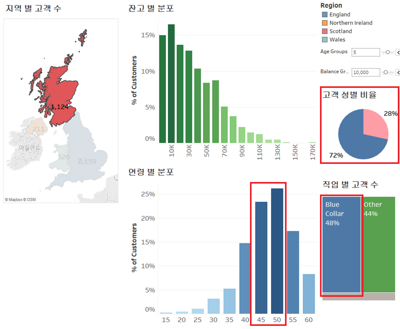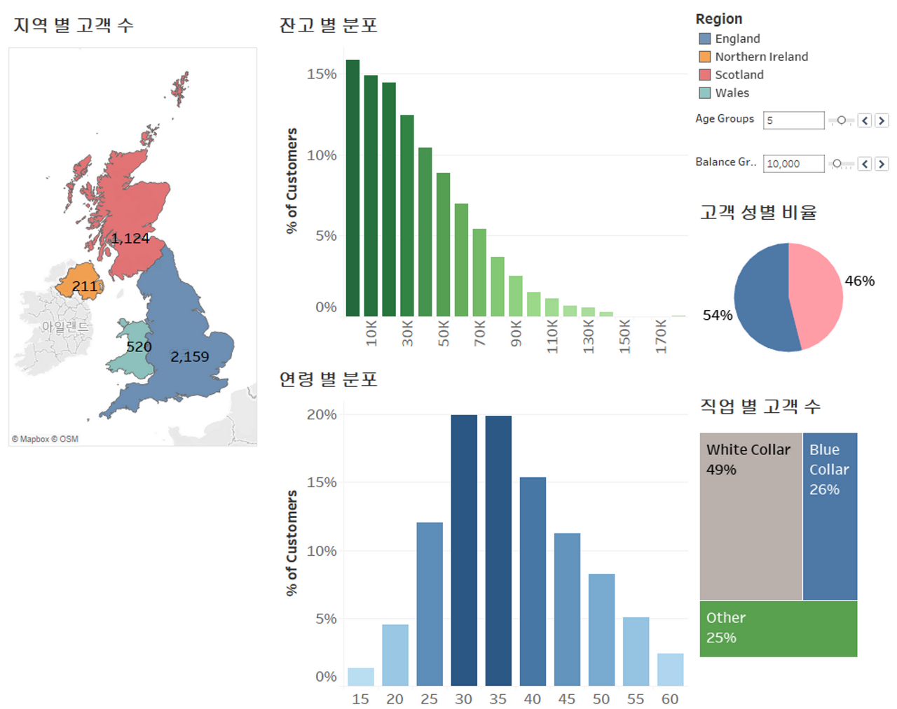 '지역 별 고객수' 지도 그래프에서 확인하고자 하는 지역을 클릭하면 그 지역의 데이터로 새롭게 시각화된다.