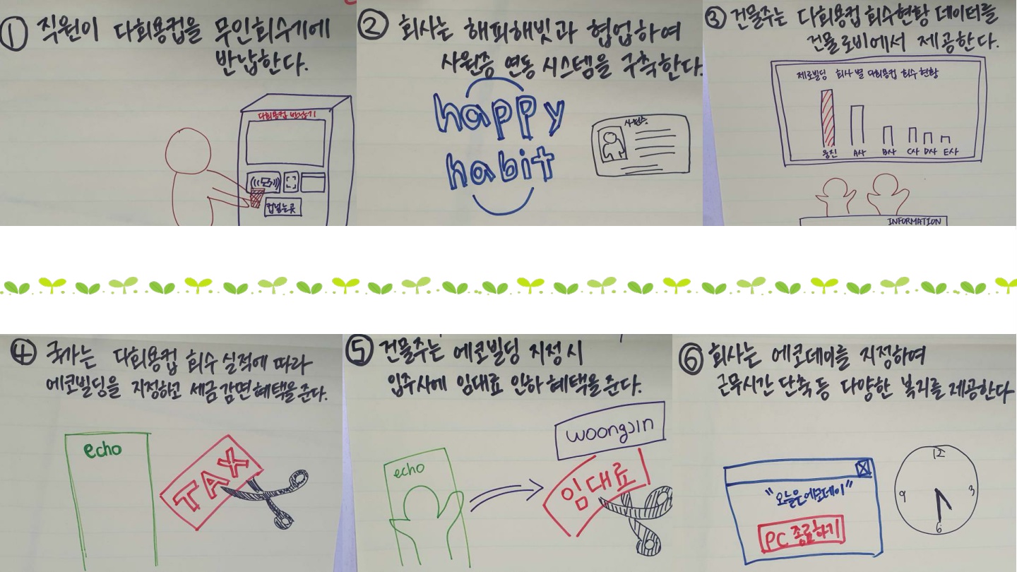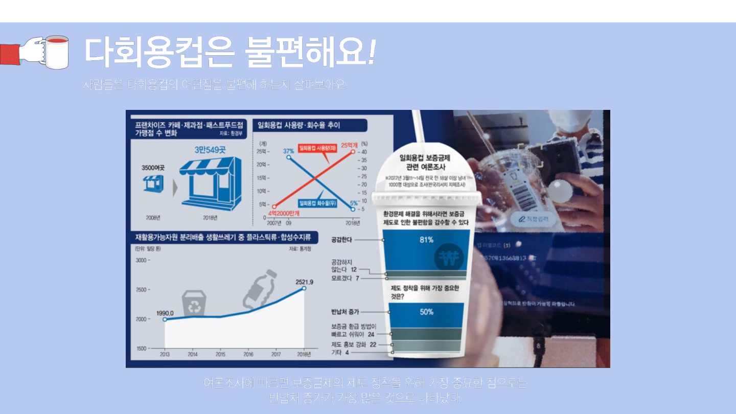 - 아이템 : 일회용컵이 많이 소비되며, 다회용컵의 사용을 유도하고 있으나 실효성에 대한 문제가 제기된다.