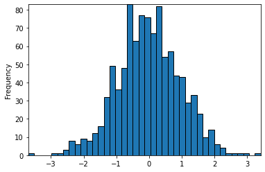 df1['A'].plot.hist(bins=40, edgecolor='k').autoscale(enable=True, axis='both', tight=True)