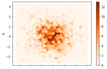 df.plot.hexbin(x='a',y='b',gridsize=25,cmap='Oranges');
