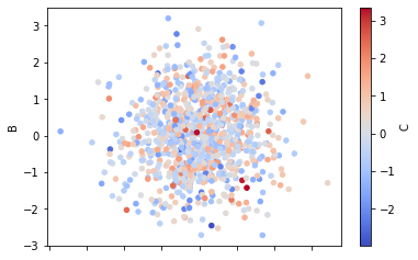 df1.plot.scatter(x='A',y='B',c='C',cmap='coolwarm');