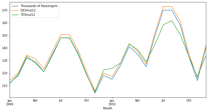 df['DESmul12'] = ExponentialSmoothing(df['Thousands of Passengers'], trend='mul').fit().fittedvalues.shift(-1)