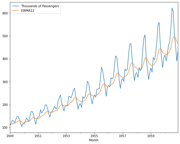 df['EWMA12'] = df['Thousands of Passengers'].ewm(alpha=alpha,adjust=False).mean()