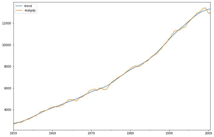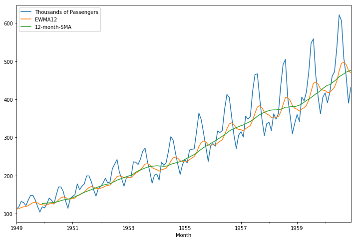 airline[['Thousands of Passengers','EWMA12','12-month-SMA']].plot(figsize=(12,8)).autoscale(axis='x',tight=True);