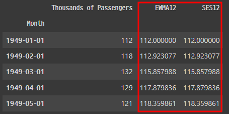 df['SES12']=SimpleExpSmoothing(df['Thousands of Passengers']).fit(smoothing_level=alpha,optimized=False).fittedvalues.shift(-1)