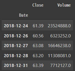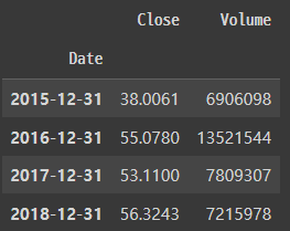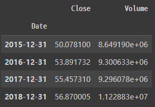 아래의 코드를 통해 연간 평균 종가와 거래되는 주식의 평균 거래량을 확인할 수 있다.