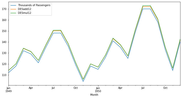 df['DESadd12'] = ExponentialSmoothing(df['Thousands of Passengers'], trend='add').fit().fittedvalues.shift(-1)