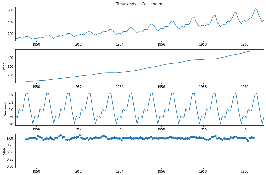 df['TESmul12'] = ExponentialSmoothing(df['Thousands of Passengers'],trend='mul',seasonal='mul',seasonal_periods=12).fit().fittedvalues