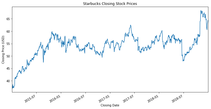df['Close'].resample('A').mean().plot.bar(title='Yearly Mean Closing Price for Starbucks');