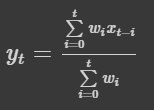 실제 출력 값인 yt는 xt+(1−α)xt−1+(1−α)2xt−2+...+(1−α)tx01+(1−α)+(1−α)2+...+(1−α)t까지 계속되는 값이 들어가고 분모에는 분자의 계수인 가중치들의 합이 들어간다. wi를 (1-α)t로 바꾼 것과 같다