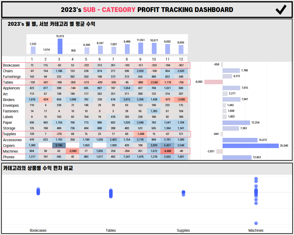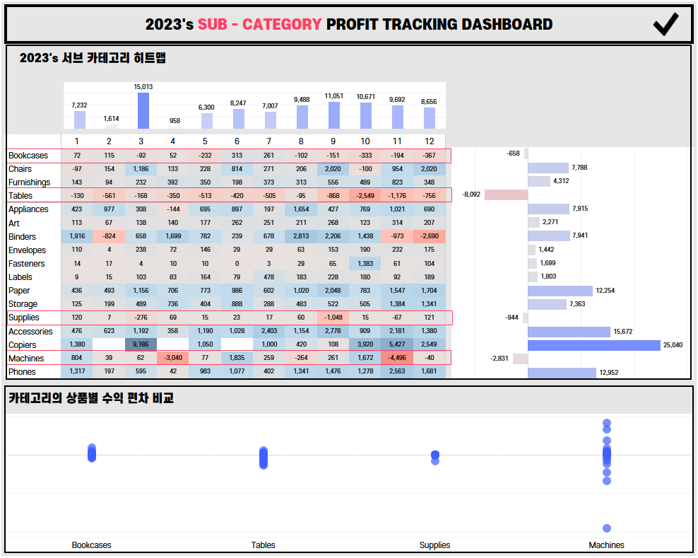 - 우측 막대그래프 : Sub - Category 별 수익 현황 (0 기준)