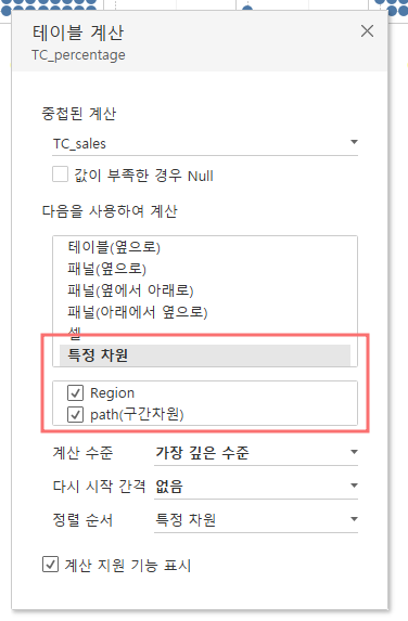 13) TC_percentage 열에 드래그 + 불연속형으로 변경 + 테이블 계산 편집 (특정차원 path까지 선택) + 다음을 사용하여 계산 (path(구간차원))