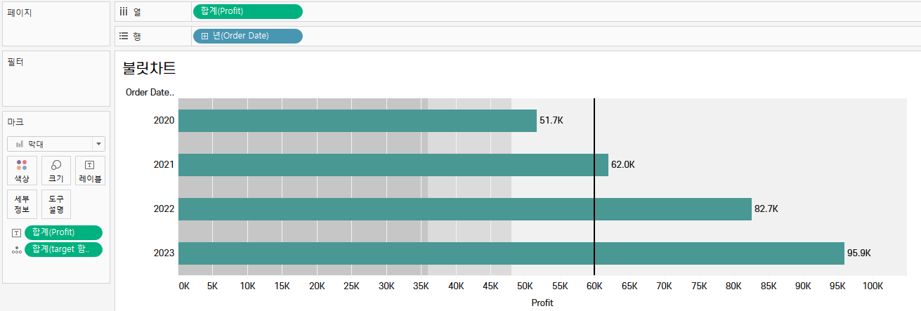 5) order date를 행으로 드래그 + 막대그래프로 변경