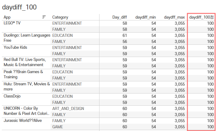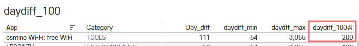 | App | Rank | Category/Genres | Ratings | Reviews | Day_diff | 최종 Score |