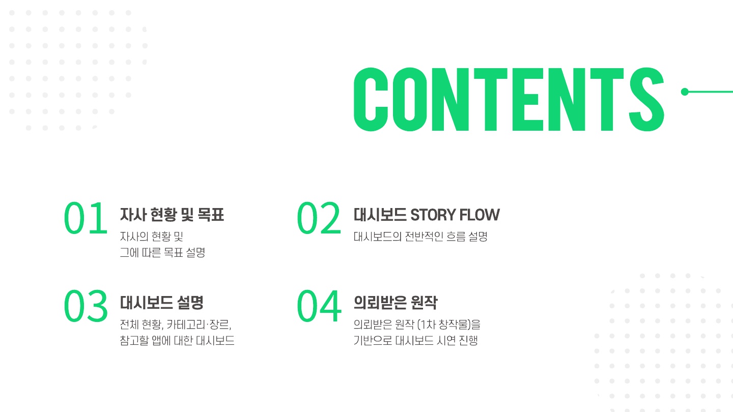 우리는 상황 설정한 아이디어가 절반 이상이기 때문에 이를 대시보드에 잘 녹이는 것이 매우 중요하다.