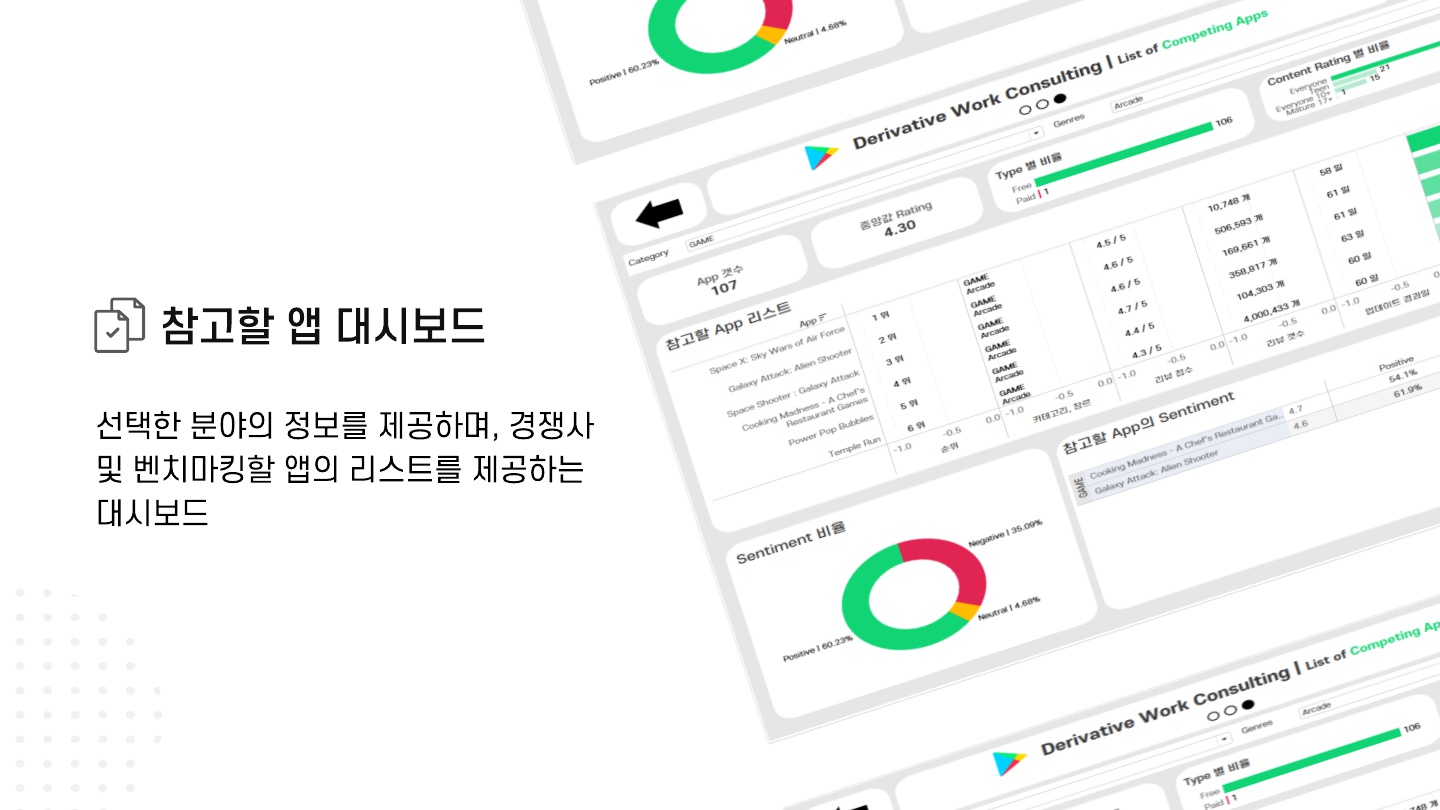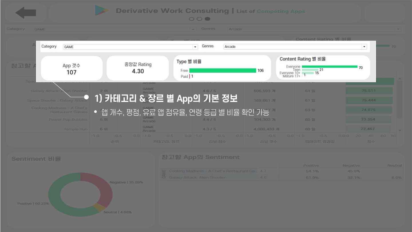 선택한 카테고리, 장르의 정보를 제공하며, 경쟁사 및 벤치마킹할 앱의 리스트를 제공
