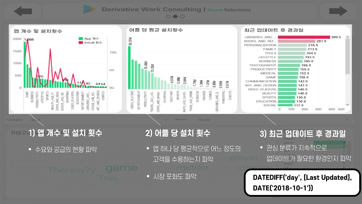 - 위의 4가지 그래프는 지정한 카테고리, 장르 별 데이터를 활용하여 표현 (초기와는 다르게 진행)
