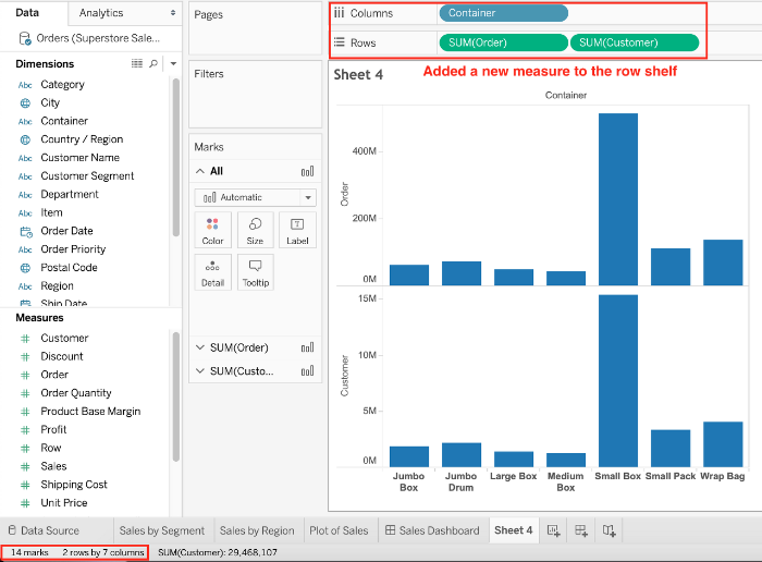 → 열 : dimension 1개 / 행 : measure 1개가 있을 때, 열/행 선반에 하나의 새로운 measure을 추가하면 어떻게 될까?