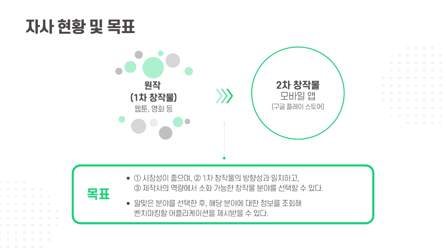 - 2차 창작물 앱 제작에 있어 시장성이 좋으며, 원작의 방향성과 일치하고, 제작사의 역량에서 소화 가능한 창작물 분야를 선택