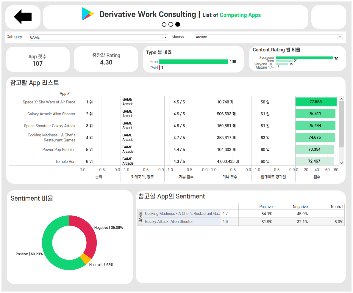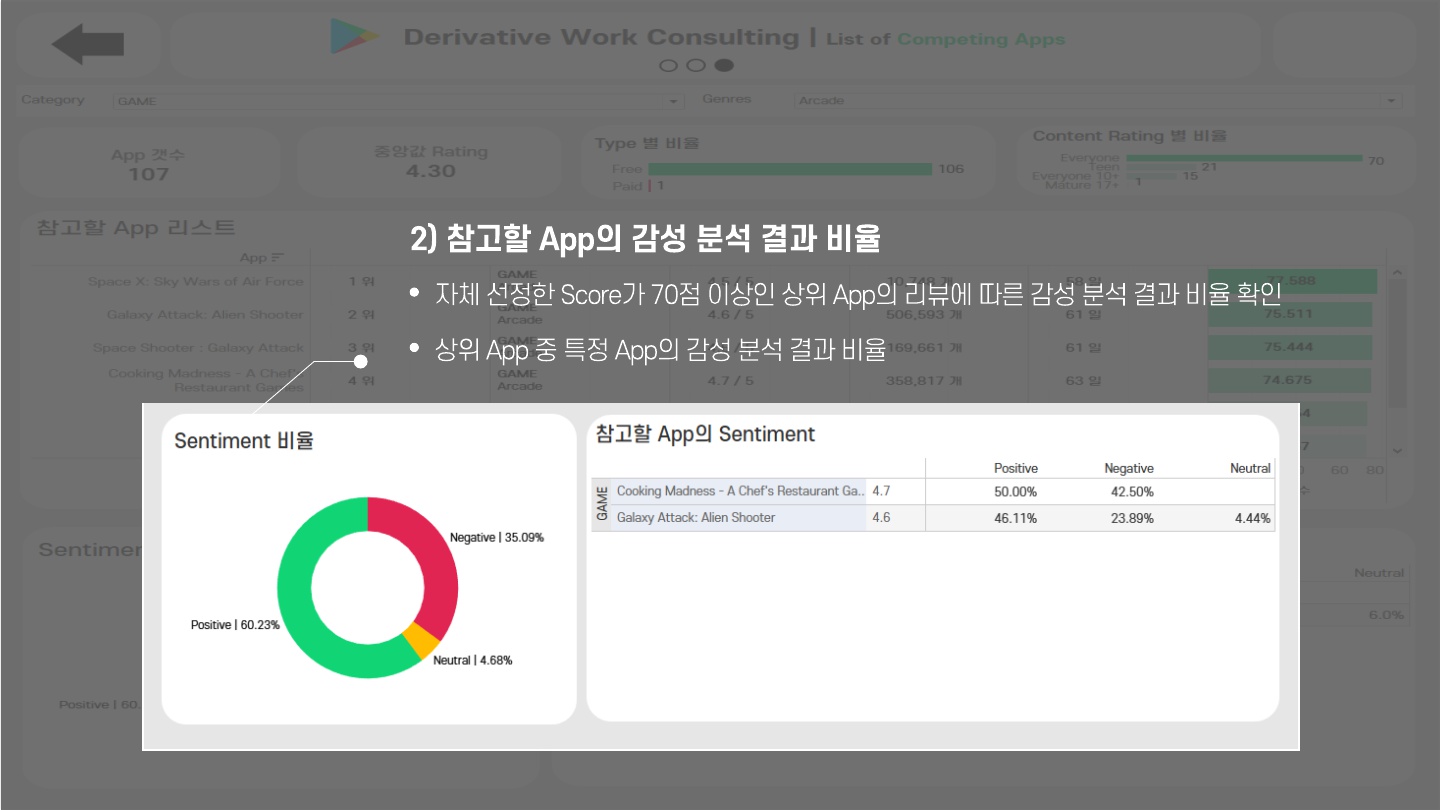 - 상위 App 중 리뷰 데이터에 있는 App의 감성 분석 결과 비율과 App의 감성 분석 결과를 리스트로 나타냄