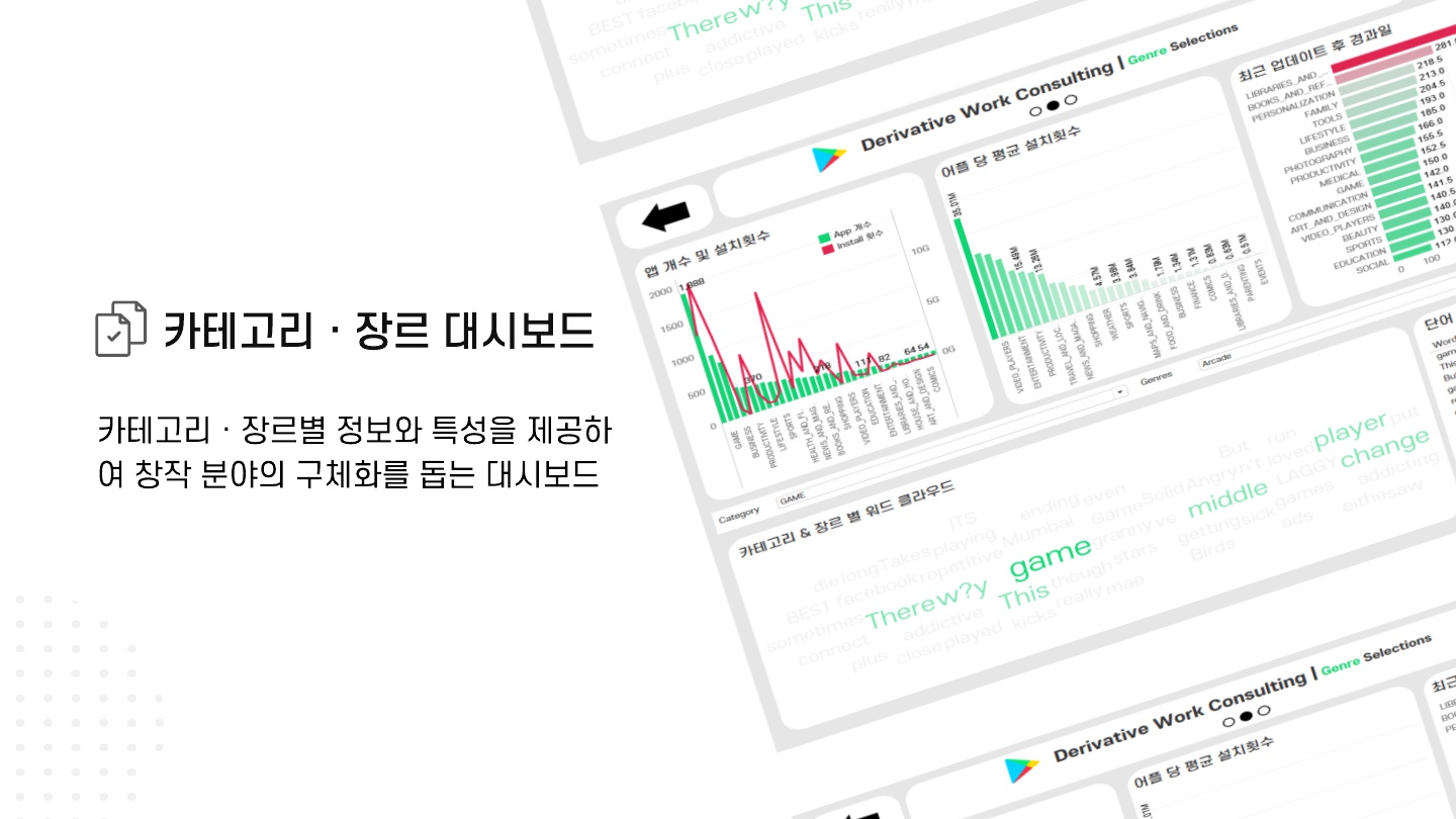 - 위의 4가지 그래프는 지정한 카테고리, 장르 별 데이터를 활용하여 표현 (초기와는 다르게 진행)