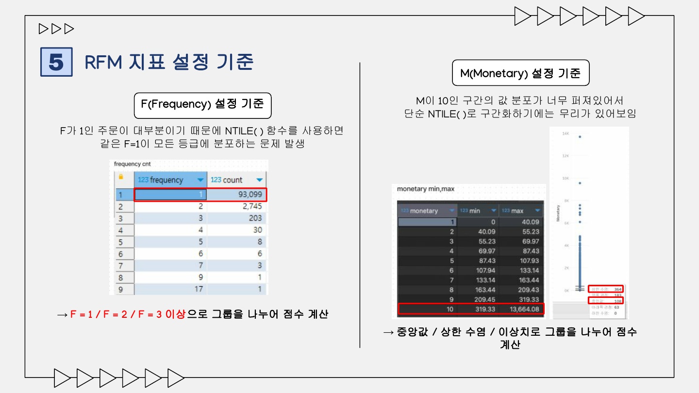 ✔ RFM 분석을 통한 R, F, M 지표를 설정한 기준을 보여주었으며, 이렇게 기준을 설정한 이유도 설명함