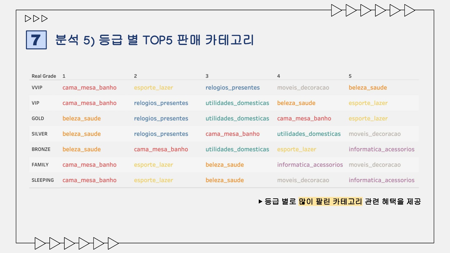 ⑤ 등급 별 TOP 5 판매 카테고리 → 등급 별로 많이 팔린 카테고리 관련 혜택을 제공