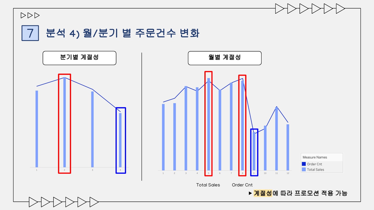 ④ 월/분기 별 주문건수 변화 → 계절성에 따라 프로모션 적용 가능