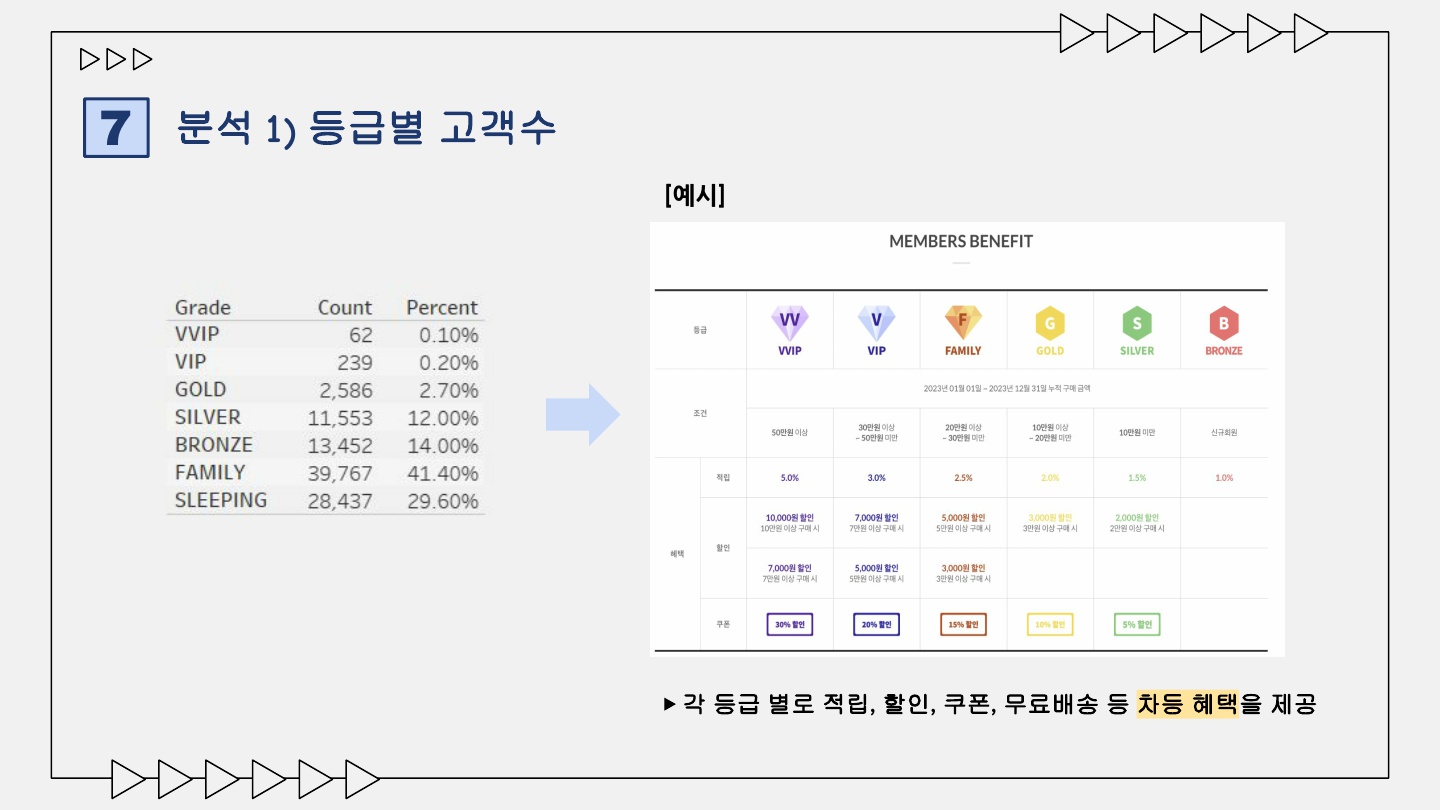 ① 등급 별 고객수 → 각 등급 별로 적립, 할인, 쿠폰, 무료배송 등 차등 혜택을 제공